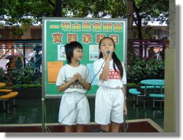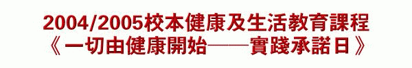 目的:1.讓同學認識健康生活和個人衛生的重要; 2.讓同學實踐環境清潔的技能。 舉辦日期:2004年9月10日(星期五):一至三年級 2004年9月11日(星期六):四至六年級 對象:全校師生 內容:- 全體學生一起簽署「個人健康承諾書」; - 班主任講解及指導學生進行簽署「健康課室承諾書」; - 由班主任鼓勵及指導學生進行課室清潔,實踐衛生承諾; - 校長及評判老師巡視,選出各級「最同心合力大獎」; - 學生與家長一起分享《一切由健康開始──實踐承諾日》,並回家完成「健康生活我做到」工作紙。